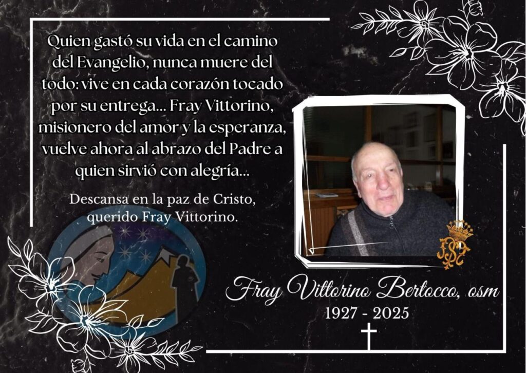 Con profundo pesar despedimos al querido fraile Vittorino Bertocco, quien ha partido a la Casa del Padre. Su vida fue testimonio de fe, humildad y servicio incansable a los demás. Su ejemplo permanecerá como luz en nuestros corazones y guía en nuestro camino. Agradecemos a Dios por su entrega generosa y por todo el bien que sembró entre nosotros. Que descanse en la paz eterna que tanto anheló y predicó.